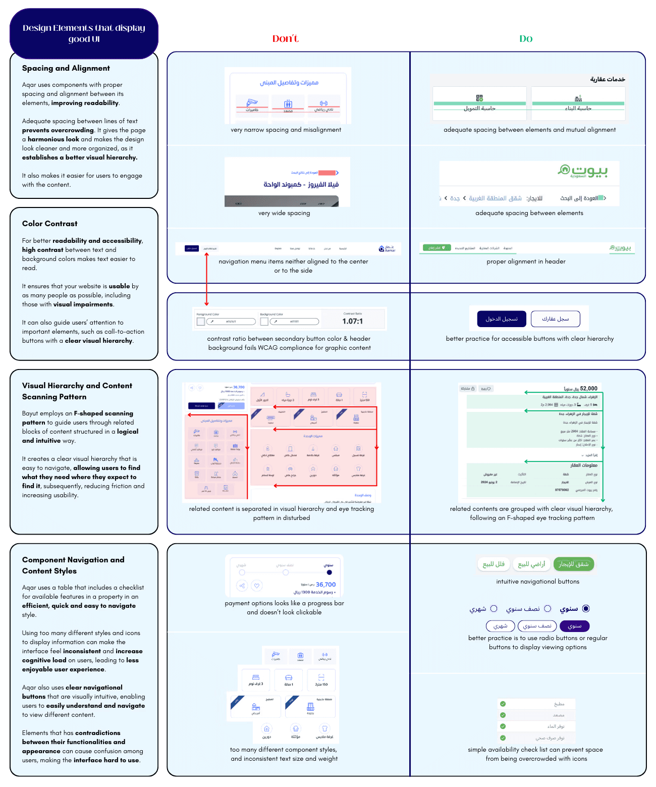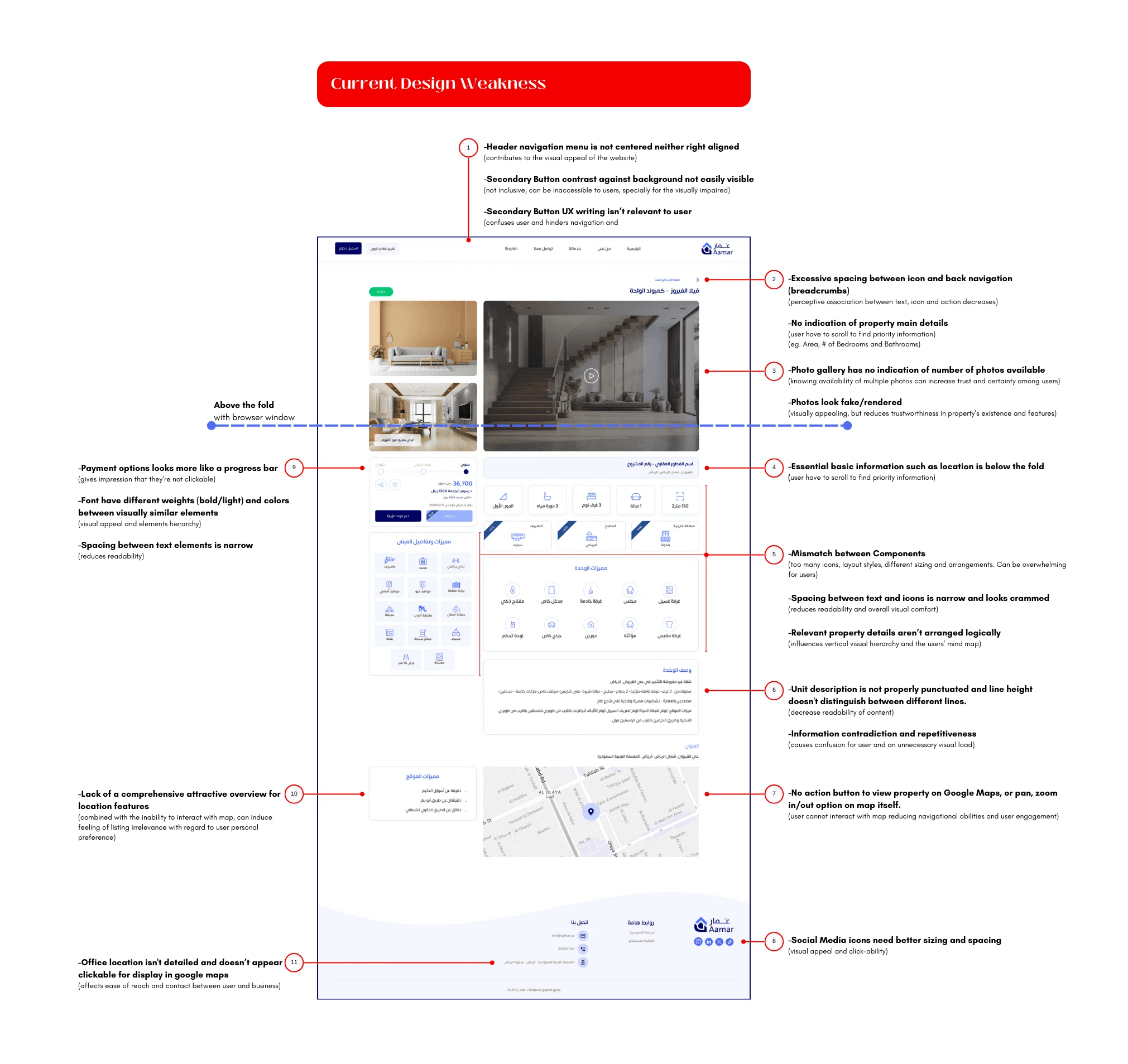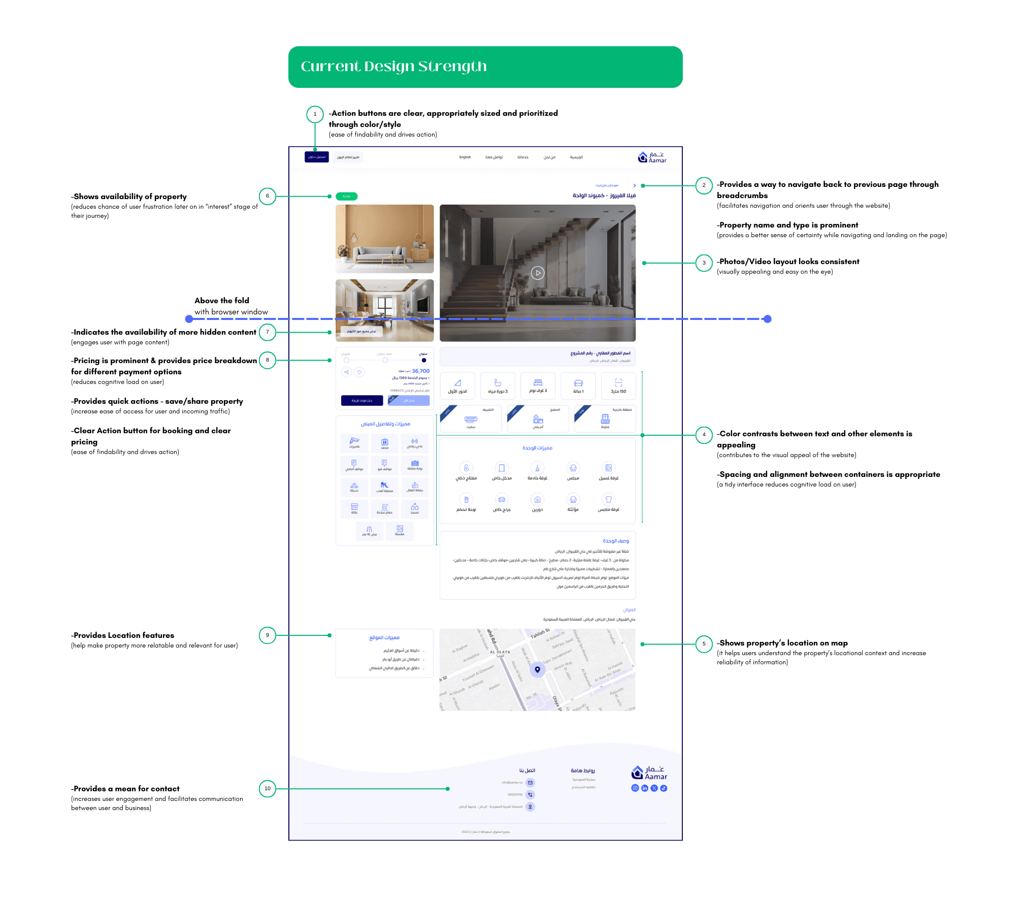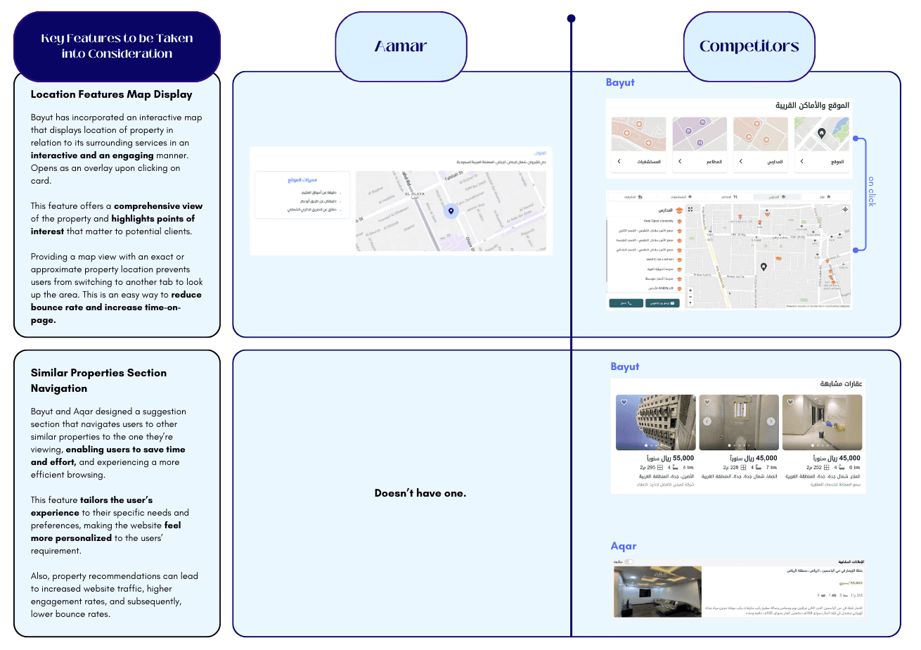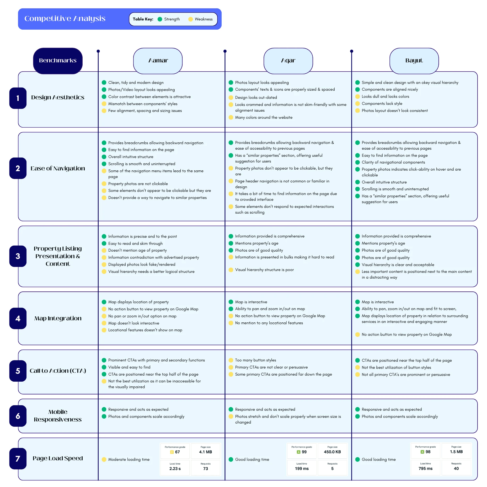 In the following table, I have identified 2 competitors of similar platforms to Aamar, with property listing pages, and performed a benchmark analysis comparing the current design with these competitors using the above benchmarking points.