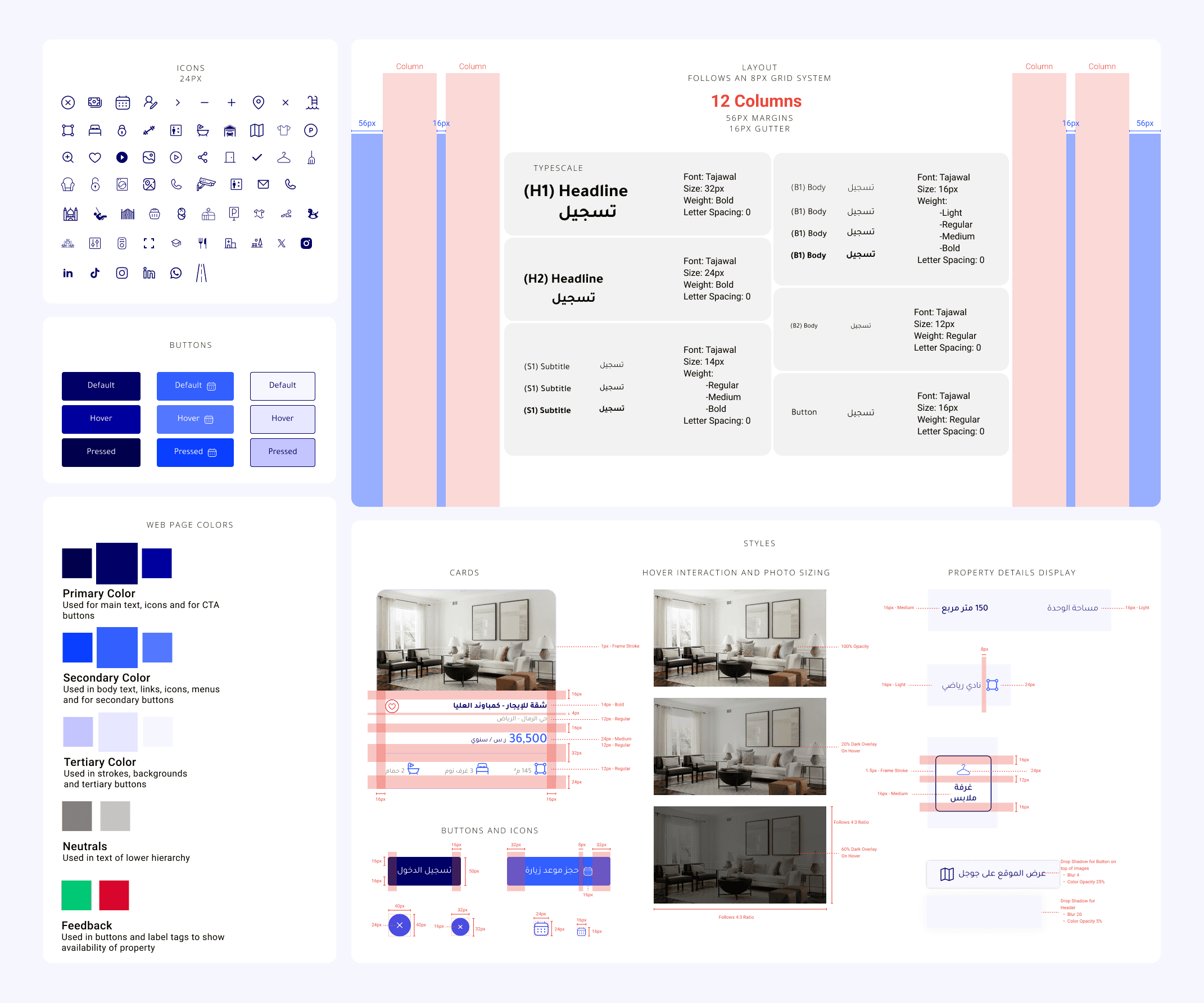 I used the 8px grid system for designing components, iconography, typography and spacing. I sized them proportionally, with the height as a multiple of 8 (16px, 24px, 32px, and 48px). While the rest of the components' followed the grid system's lines, where the interface was divided into 12 columns, with margins of 56px and gutters of 16px.