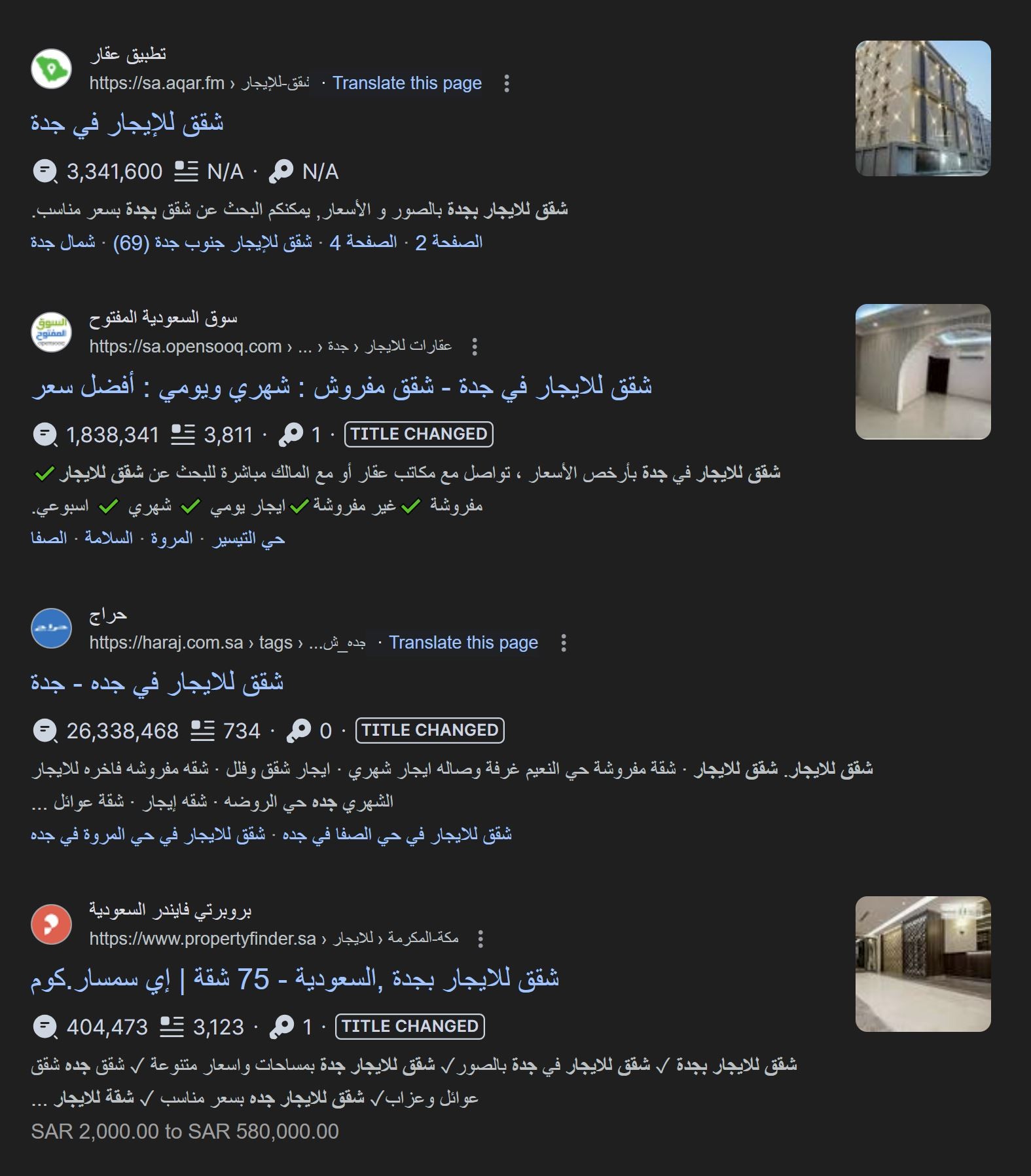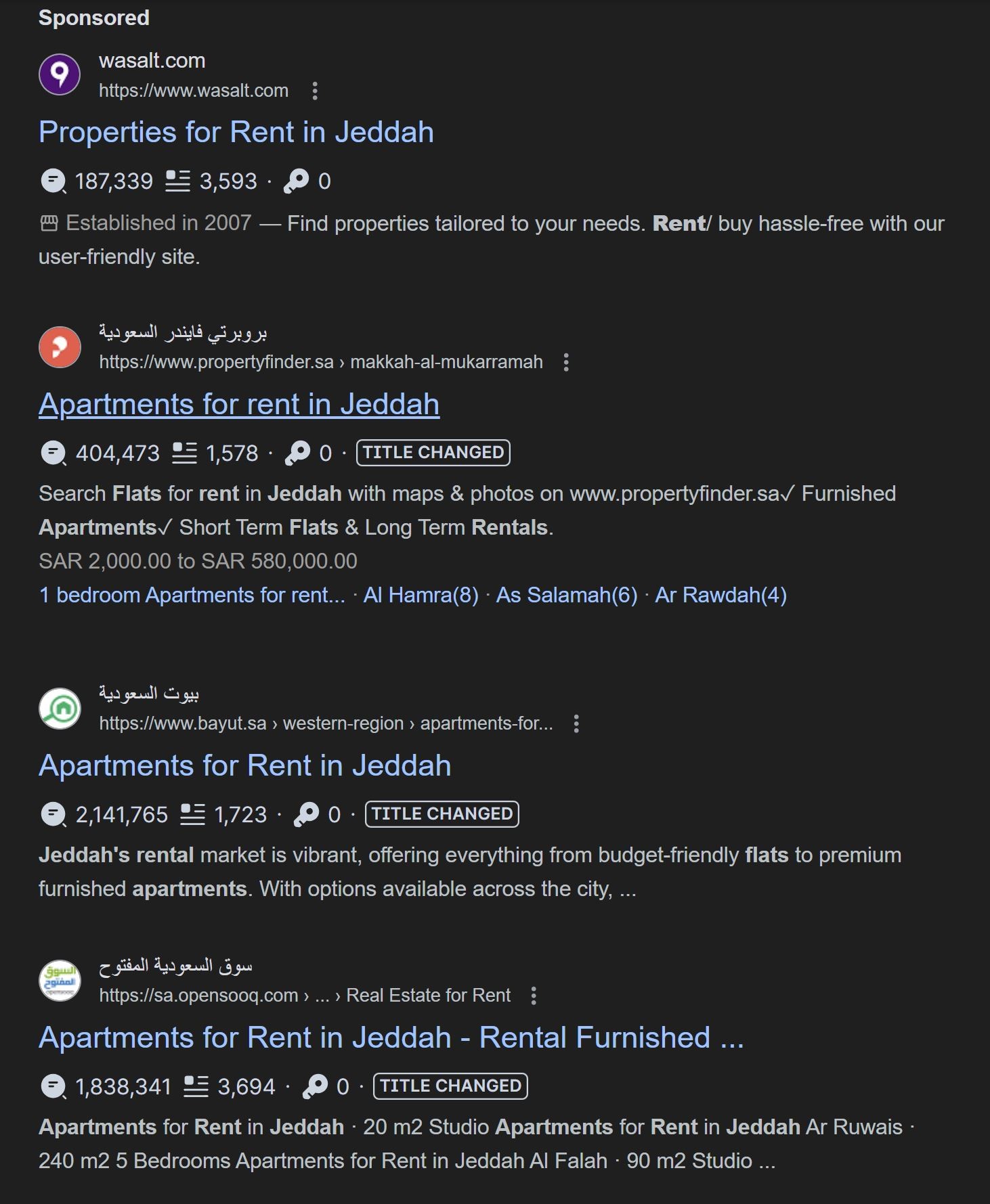 Competitors were decided based on Google Direct Search results for properties for rent in Saudi Arabia (inputs were tested with different inquiry formats). A browser plug-in was also used to identify amount of traffic to the websites ranking top on Google Search page. This search was conducted using both English and Arabic inputs.
