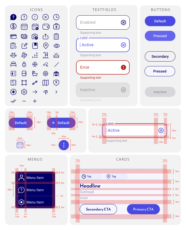 I used the 8px grid system for the iconography. I sized them proportionally, with the height as a multiple of 8 (16px, 24px, 32px, and 48px). While the rest of the components' followed the grid system's lines.