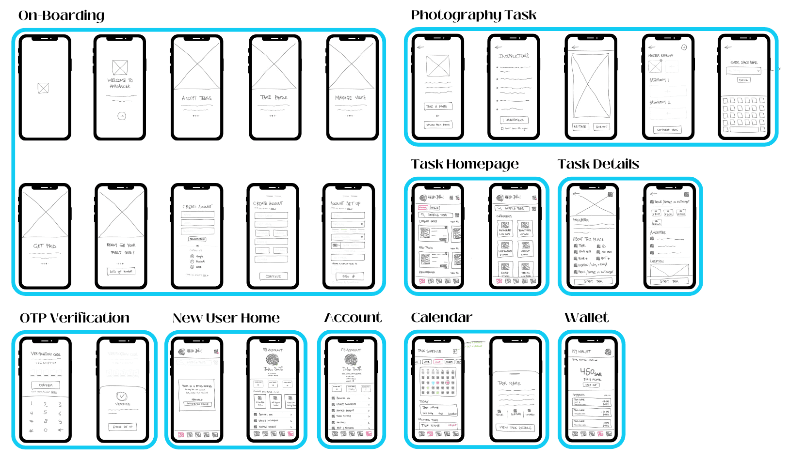 Low-Fidelity sketch designs exploring app pages, features and elements